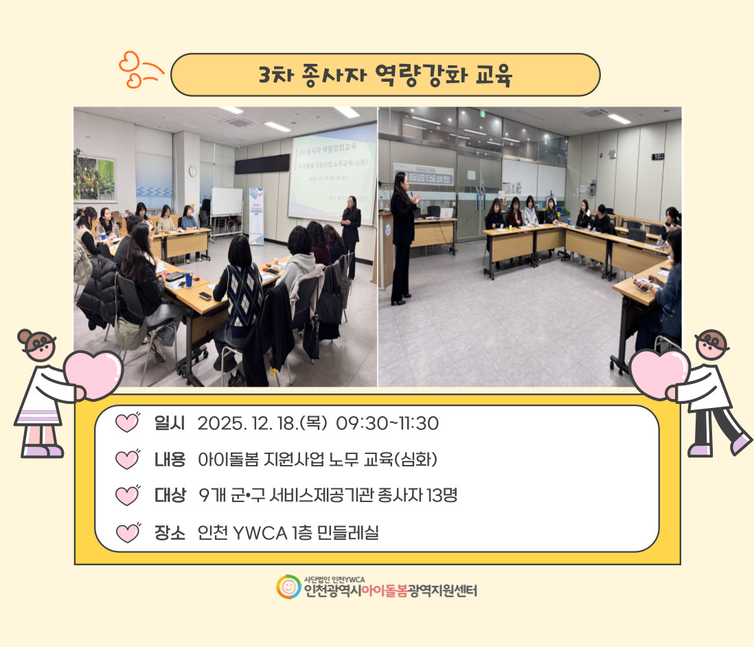 인천광역시아이돌봄광역지원센터는 2025.12.18.(목), 인천YWCA 민들레실에서 「3차 종사자 역량강화 교육」을 진행하였습니다.