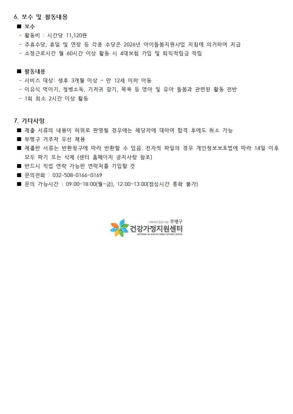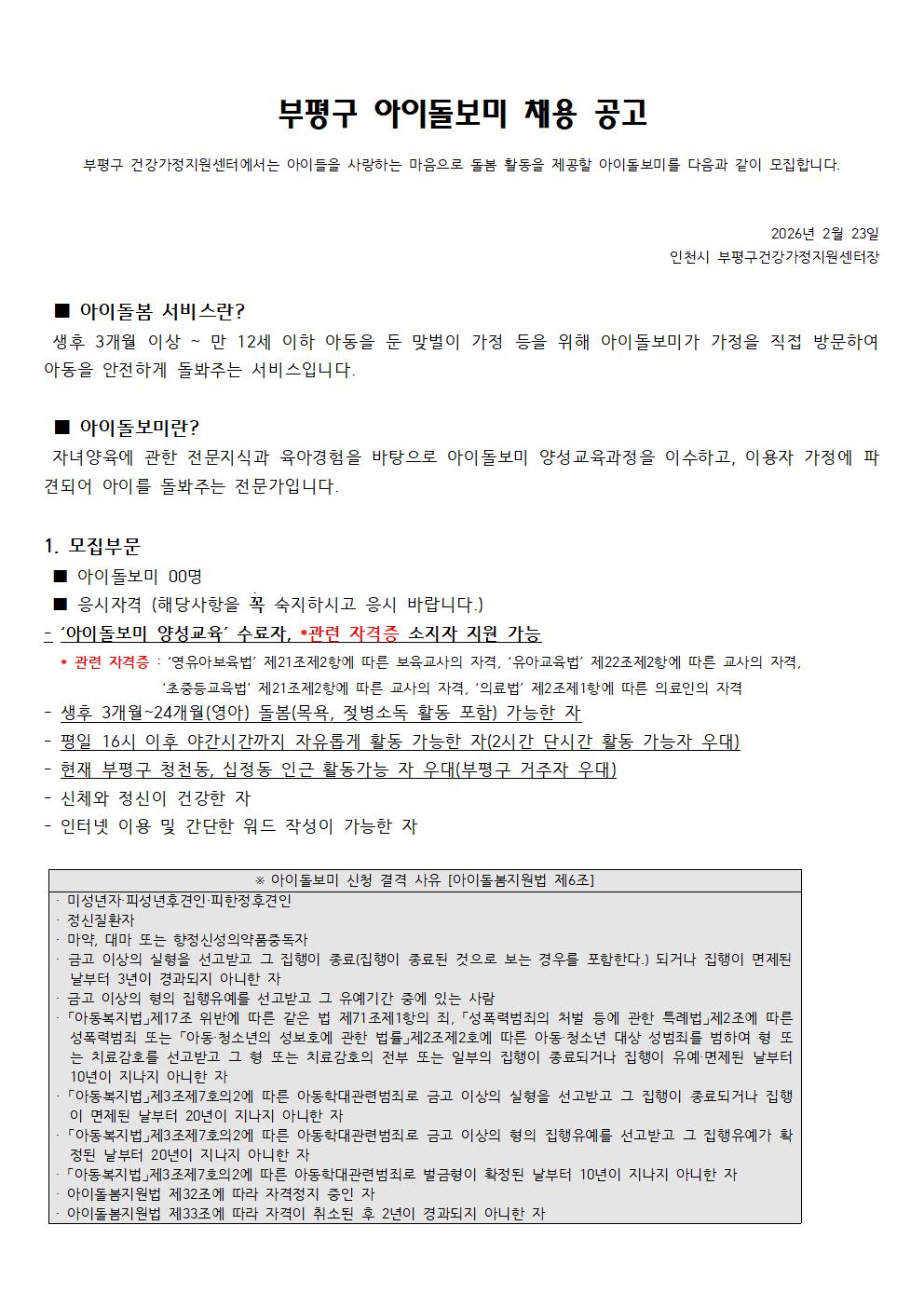 [부평구건강가정지원센터] 부평구 아이돌보미 채용 공고